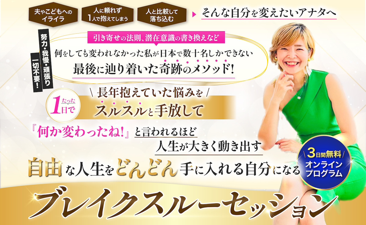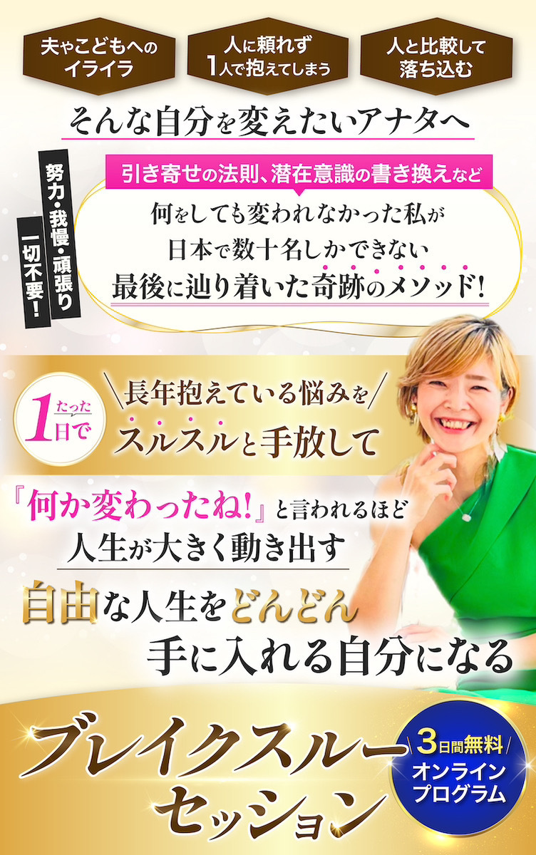 この3日間の動画プログラムを最後まで見ていただくと、悩みやモヤモヤの原因を明確に理解でき、本来の自分のまま、自分史上最高で、自由な人生を手に入れる方法が分かります。